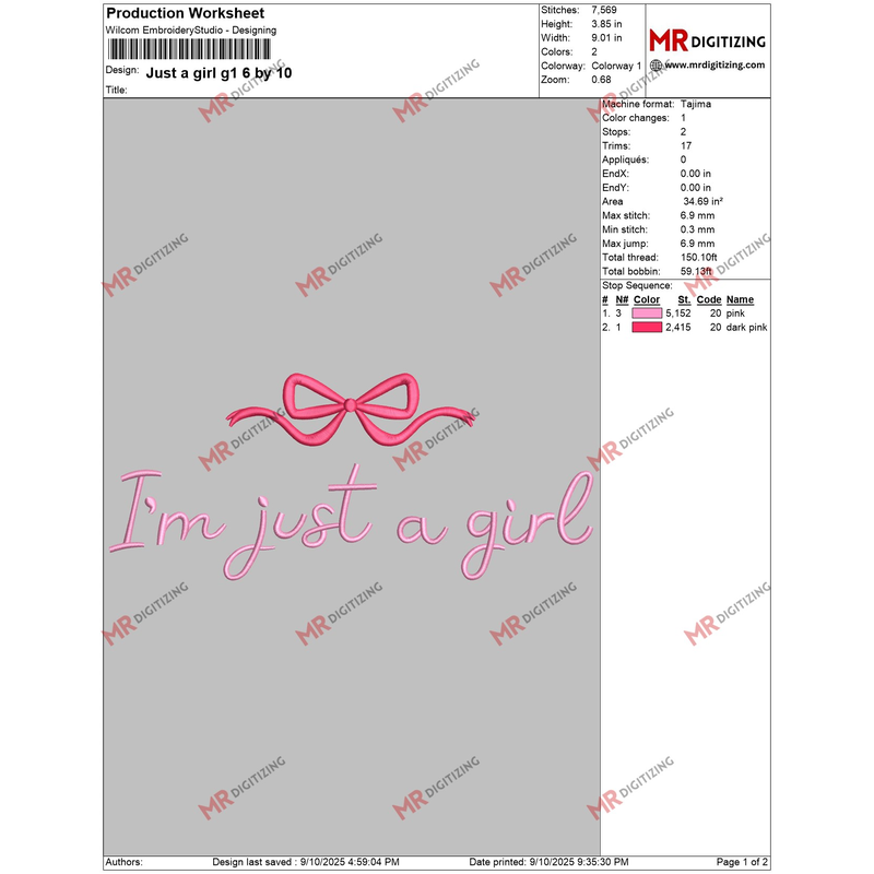 Thank you for choosing our Just a girl g1 Embroidery design!